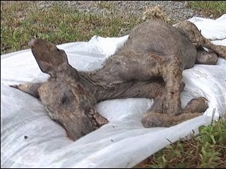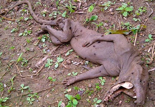 | Chupa-cabras? A maioria diz que mais provavelmente trata-se de um cão ou de um guaxinim que, por sofrer de alguma doença, teria perdido os pelos. |