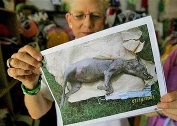 02. Phylis Canion e seu chupa-cabra de olhos azuis (Cuero - Texas - EUA)Fonte FonteA nutricionista texana Phylis Canion trás a versão olhos azuis do chupa-cabras. Ela disse que perdeu 28 galinhas, todas encontradas sem uma gota de sangue. A sorte foi que um dia ele encontrou o animal mortinho da silva no seu quintal. O animal era tipo um cachorro com lindos olhos azuis, que ele logo disse ser o chupa-cabras. O animal bizarro foi levado para análise e testes de DNA revelaram que ele é, na verdade, um animal híbrido – que descende de animais de espécies diferentes. No caso do chupa-cabra em questão, sua mãe foi um coiote fêmea e seu pai, um lobo mexicano.