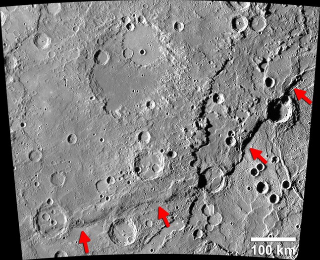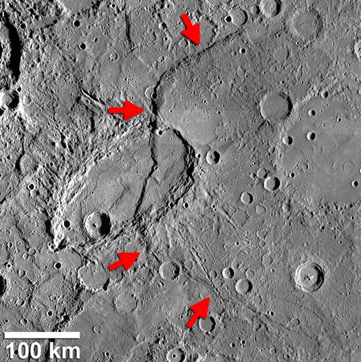 | Beagle Rupes (identificadas por setas) é uma escarpa de falha em forma de arco em Mercúrio sendo uma com as característica mais curva de seu tipo encontrado pela sonda Messenger da NASA. |